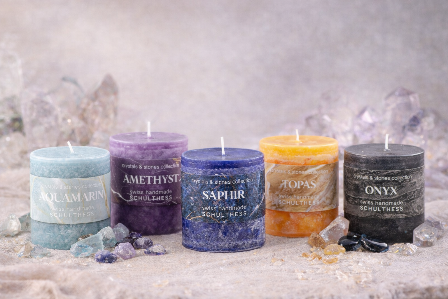 Die Kerzenkollektion „Crystals & Stones“ vereint edle Duftkompositionen mit der faszinierenden Welt der Edelsteine. Inspiriert von der Kraft und Schönheit von Onyx, Aquamarin, Amethyst, Saphir und Topas, schenkt jede Duftkerze eine besondere Atmosphäre voller Ruhe, Klarheit und Eleganz. Erhältlich als stilvolle Duftkerze in 7 x 8 cm und 7 x 12 cm sowie im schlichten Braunglas, durch welches das Kerzenlicht sanft und warm schimmert.